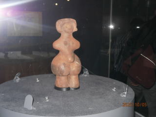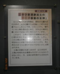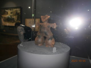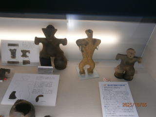 尖石縄文考古館写真 下左 国宝「縄文のビーナス」粘土には、金色に輝く雲母まざっている、ハートの顔、逆ハート のお尻が特徴で妊娠した女性を表している。安産祈願・子孫繁栄。 下右 仮面の女神、逆三角形の仮面をつけ、神に代わって祭りごとをする女性を表している。