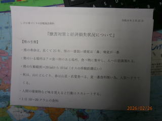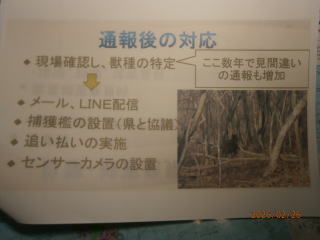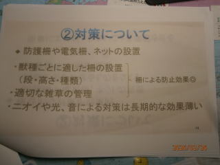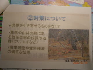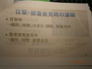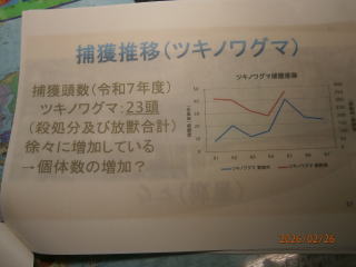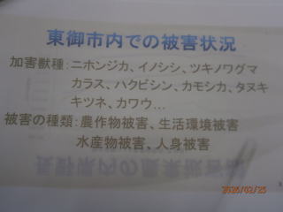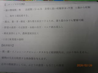 産業・環境部会講師 東御市 農林課 重田 課長 山田主任 信州うえだ農業協同組合 営農課 西澤 課長 令和8年2月25日(水) 午後6時30分~8時 滋野コミュニティセンター(多目的ホール) 演題 1,獣害に関する全般的な状況 重田 課長 2、 県と東御市内の被害状況 山田 主任 (1)獣害について ①原因、荒廃地の増加等 ②対策について フエンス、電気柵・・・ (2) 熊対策 ① 熊に出合わない為の対策 ② 出合ってしまった場合の対応 (3) 目撃、被害発見時等の対応 3、 信州うえだ農業協同組合 営農課の獣害対策と経済損矢状況 西澤 課長 熊の生態」 営農課 西澤課長 様より 講演 * 熊の寿命は、長くて25年、熊の一番鋭い間隔は「鼻」臭覚がすごい。 * 熊のいる場所は、 食べ物の有る場所。食べ物に集中し、人への意識薄れる * 熊の行動範囲は⇒20㎞から40㎞範囲 (オスは移動範囲が広い) * 秋は、山にどんぐり、春は山菜 若葉を食べる。 * 人間の廃棄物などの味を覚えると 行動がエスカレートする。 「二ホンジカ」 ;鹿の繁殖期: 秋 出産:5月~6月 非常に高い妊娠率8~9割 1歳から妊娠 *シカは 葉・芽・樹皮・落ち葉を採食出来る為、落ち葉だけでも繁殖可能 *野菜の食害・蕎麦の食害・水稲の食害・マルチ踏み荒らし *樹皮食害により、農林業被害拡大 *1日3㎏程度の食料 「経済損矢} *熊・イノシシ・ハクビシン・タヌキなど経済損失は、はかりしれません、 植物の成長を阻害する致命傷を与えます。 *近年の熊の被害としては、ぶどうの食害・とうもろこしの食害 * 地区内外29名の方々が聴講していただき、ご意見・質問等が出されました。 大変有意義な勉強会になりました。